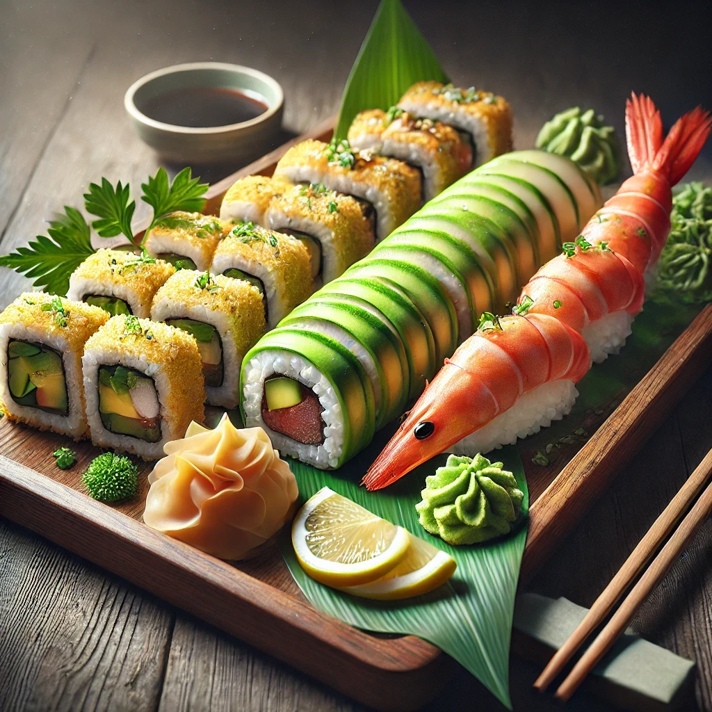 A sushi bar with fresh sushi rolls and sashimi