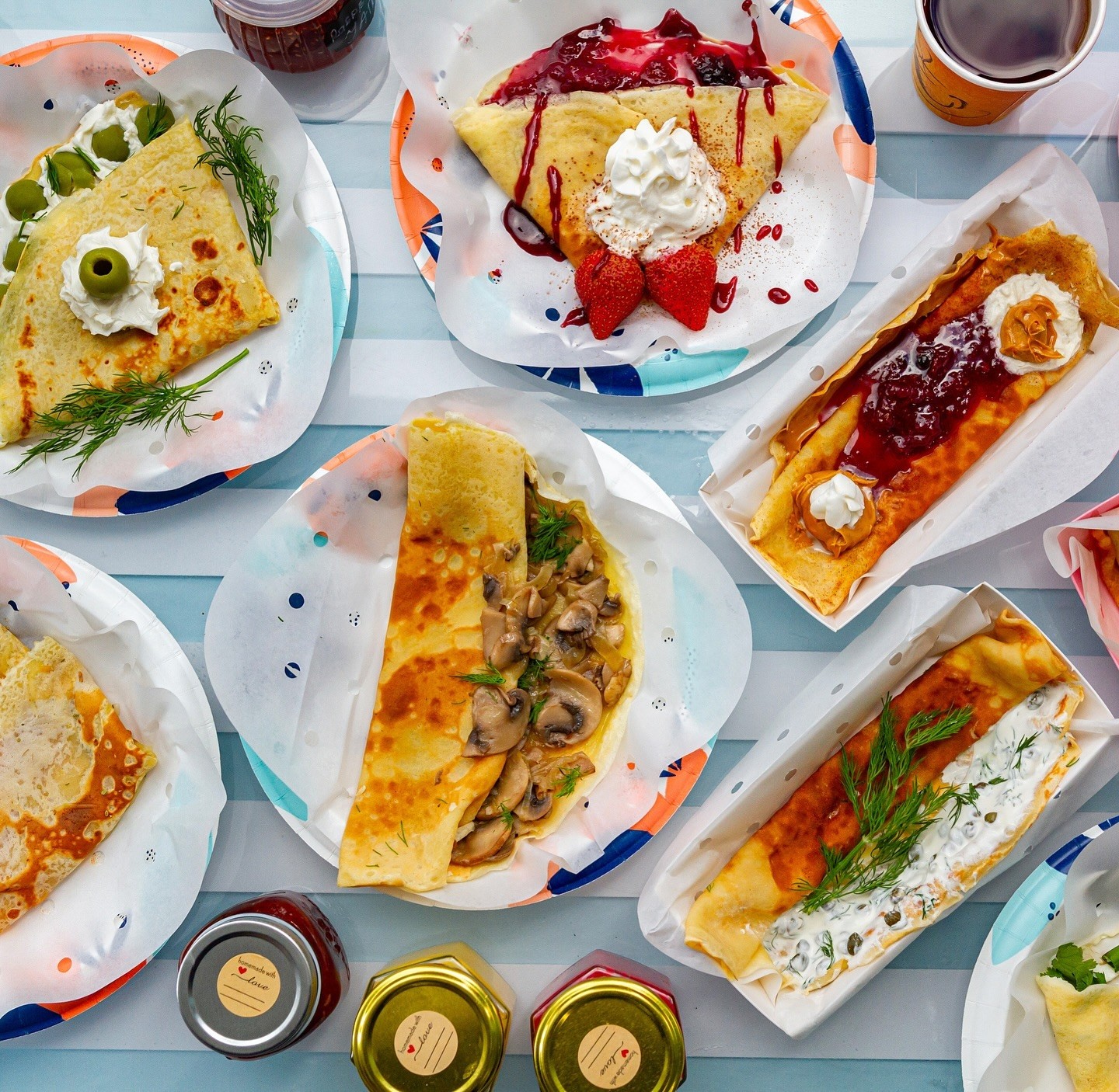 The menu is small but carefully built, with both sweet and savory options made fresh to order. On the sweeter side, there’s the Fruitella, filled with strawberries, blueberries, mascarpone, and Nutella, and the Lemon Zest Feast, brightened with smooth, house-made lemon curd. For savory cravings, the names get cheeky: Leaf Me Alone layers mozzarella, tomato, and basil; Popeye the Sailor packs in spinach and scallions; and Fun Guy, a fan favorite, stars mushrooms and caramelized onions with a hit of dill. Each crepe comes with a playful name and thoughtful ingredients that balance comfort and creativity. And if you return your jam jar, you’ll get a little discount, as just one of the many ways the shop stays personal and planet-friendly.