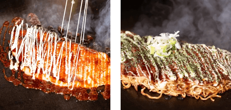 • Okonomiyaki: Often called a savory Japanese pancake, this dish is made with a batter mixed with vegetables and protein like pork or seafood. It’s topped with barbecue sauce, Japanese mayo, bonito flakes, and seaweed, creating layers of flavor in every bite.