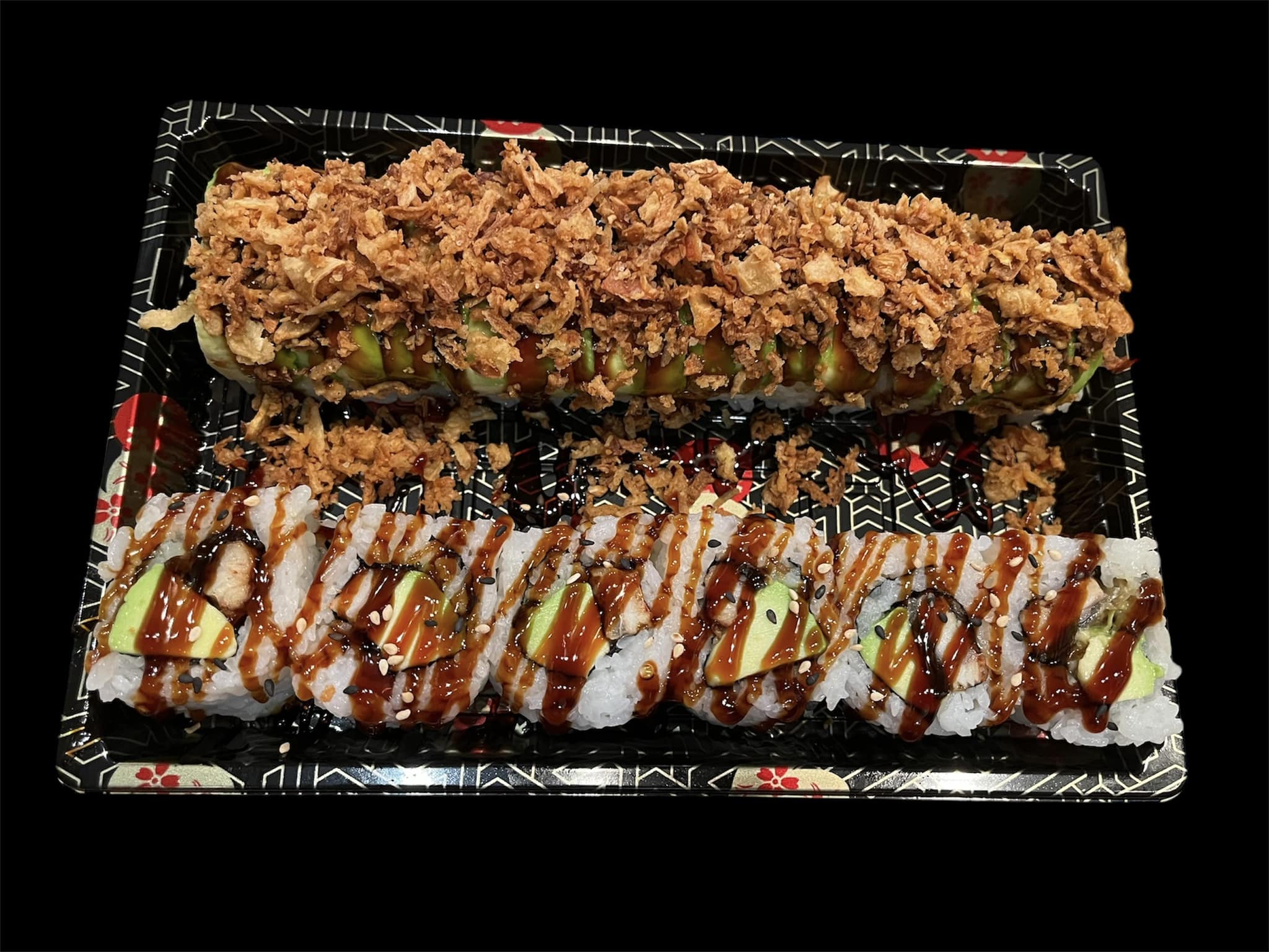 Angry Dragon Roll – A shrimp tempura roll topped with imitation crab, crunchy onion, and spicy mayo. Tsering says customers often tell her it’s “the biggest sushi roll they’ve ever had.”